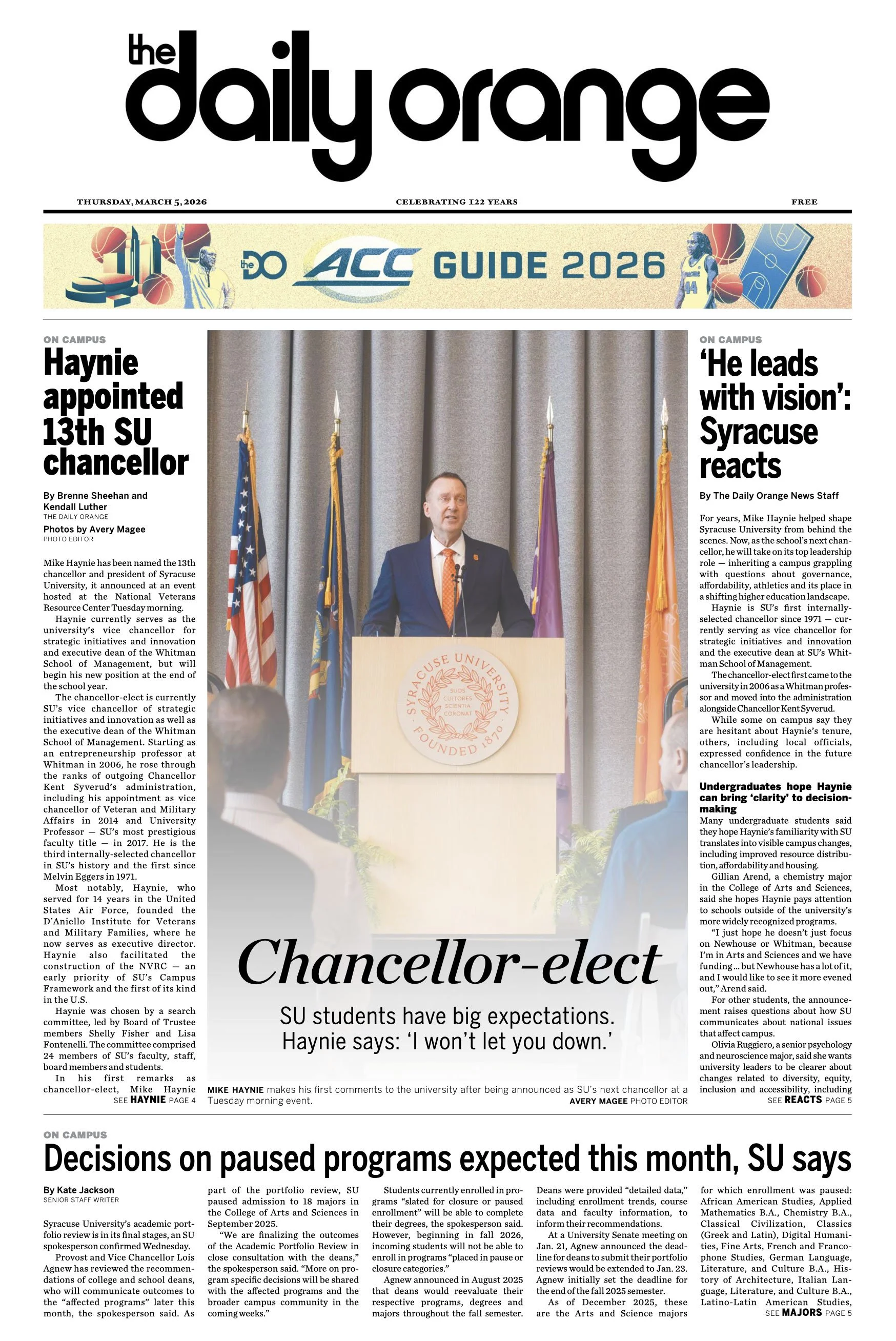 Recent articles include a look inside intercollegiate a cappella championships, the closing of New York State college campuses due to weather, Syracuse woman’s sports attendance, and ICE protests by CNY Solidarity.