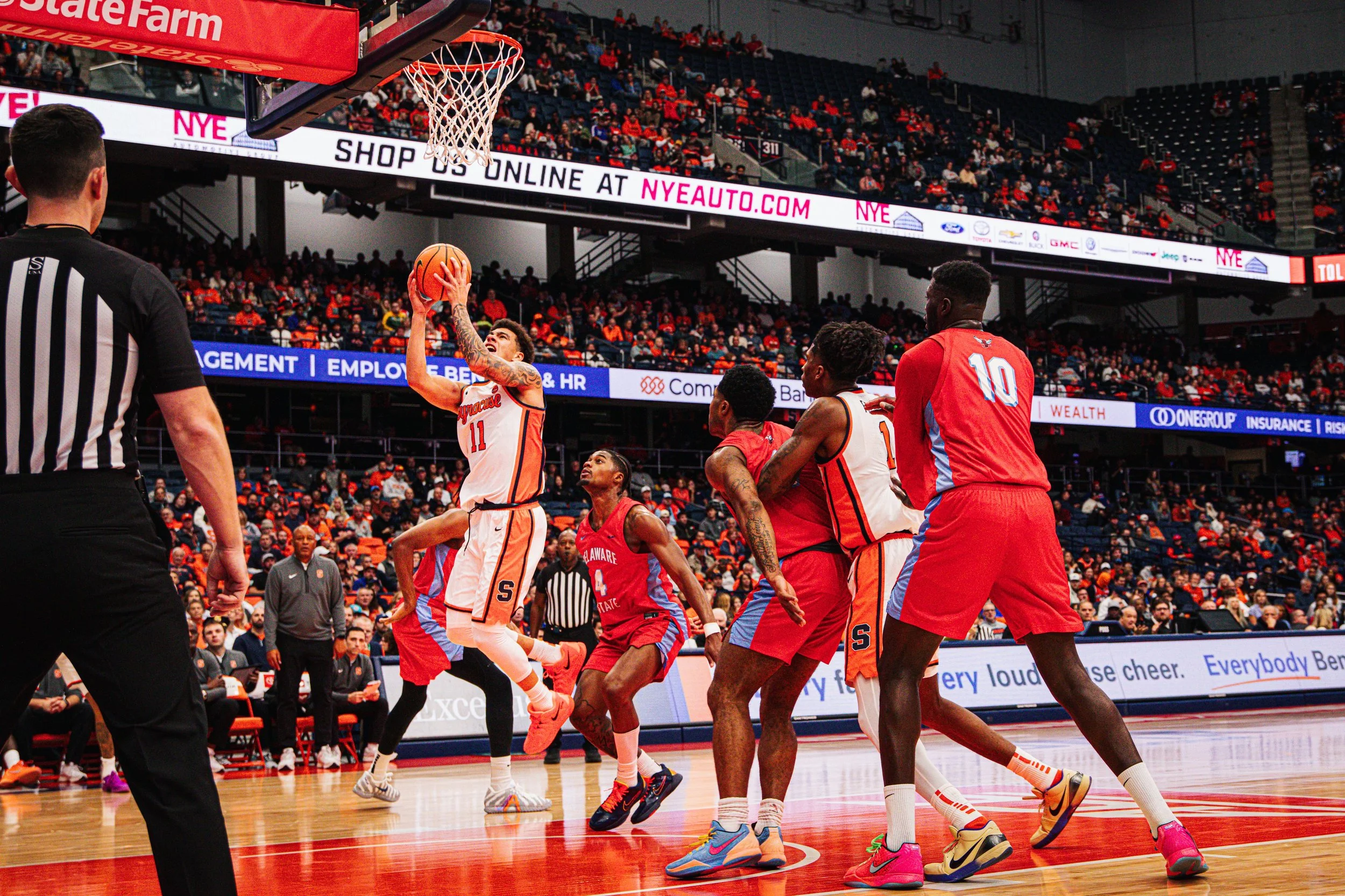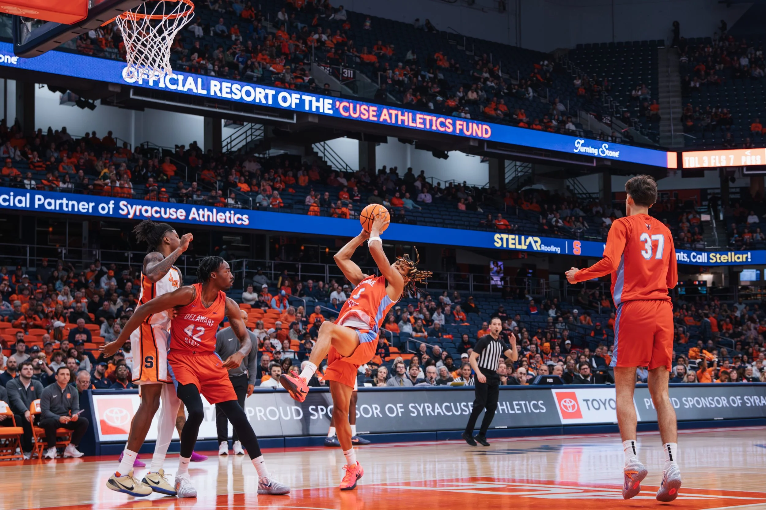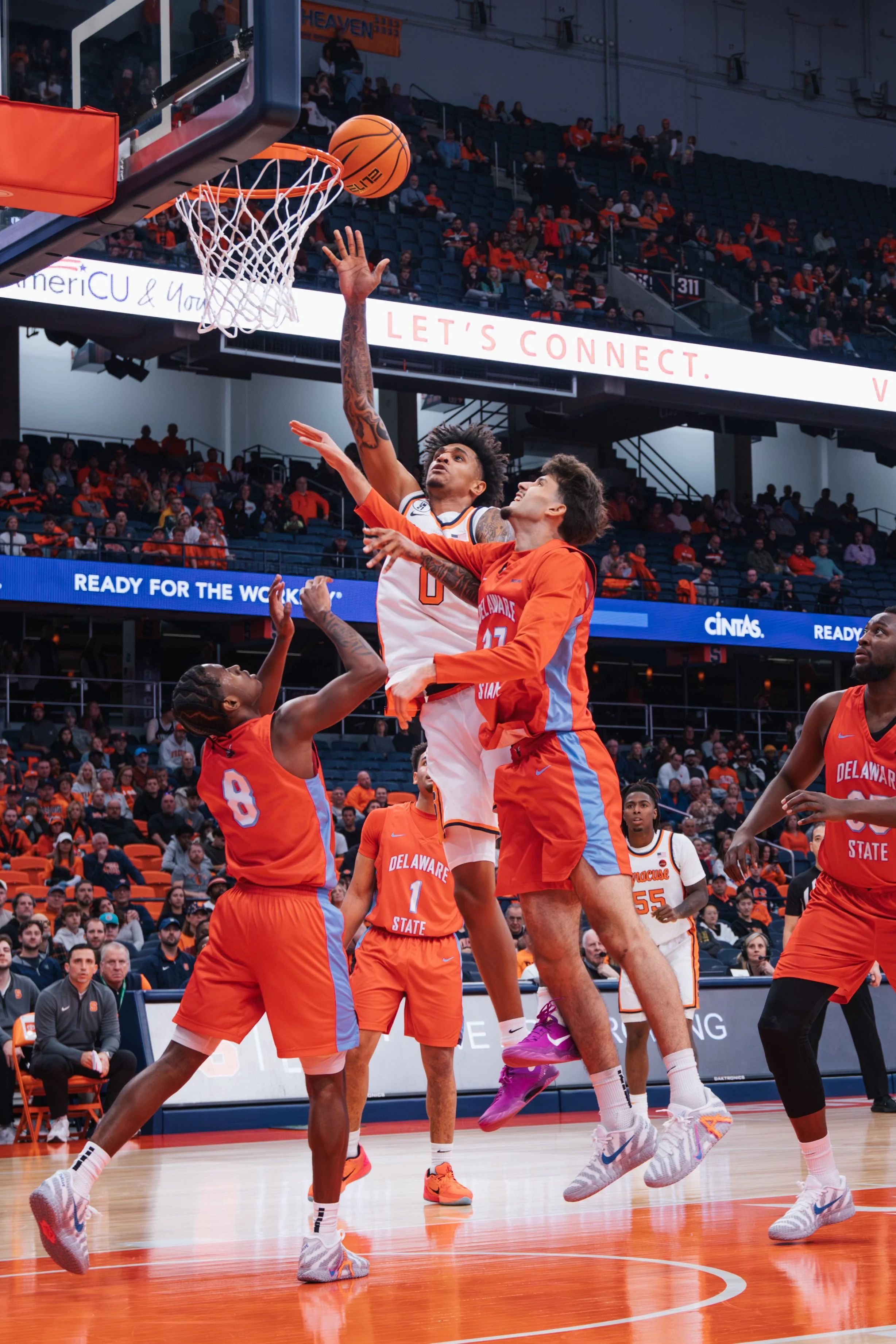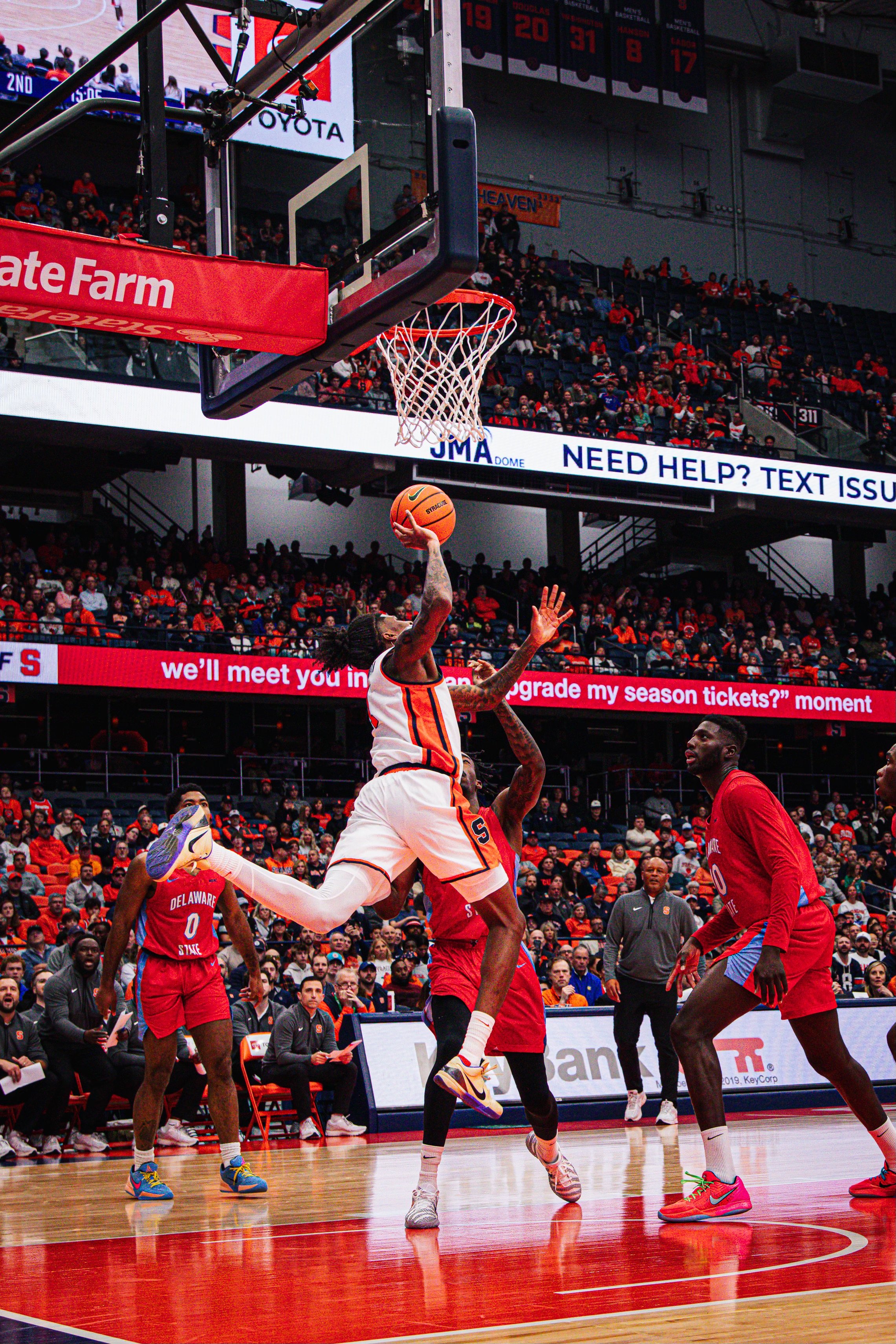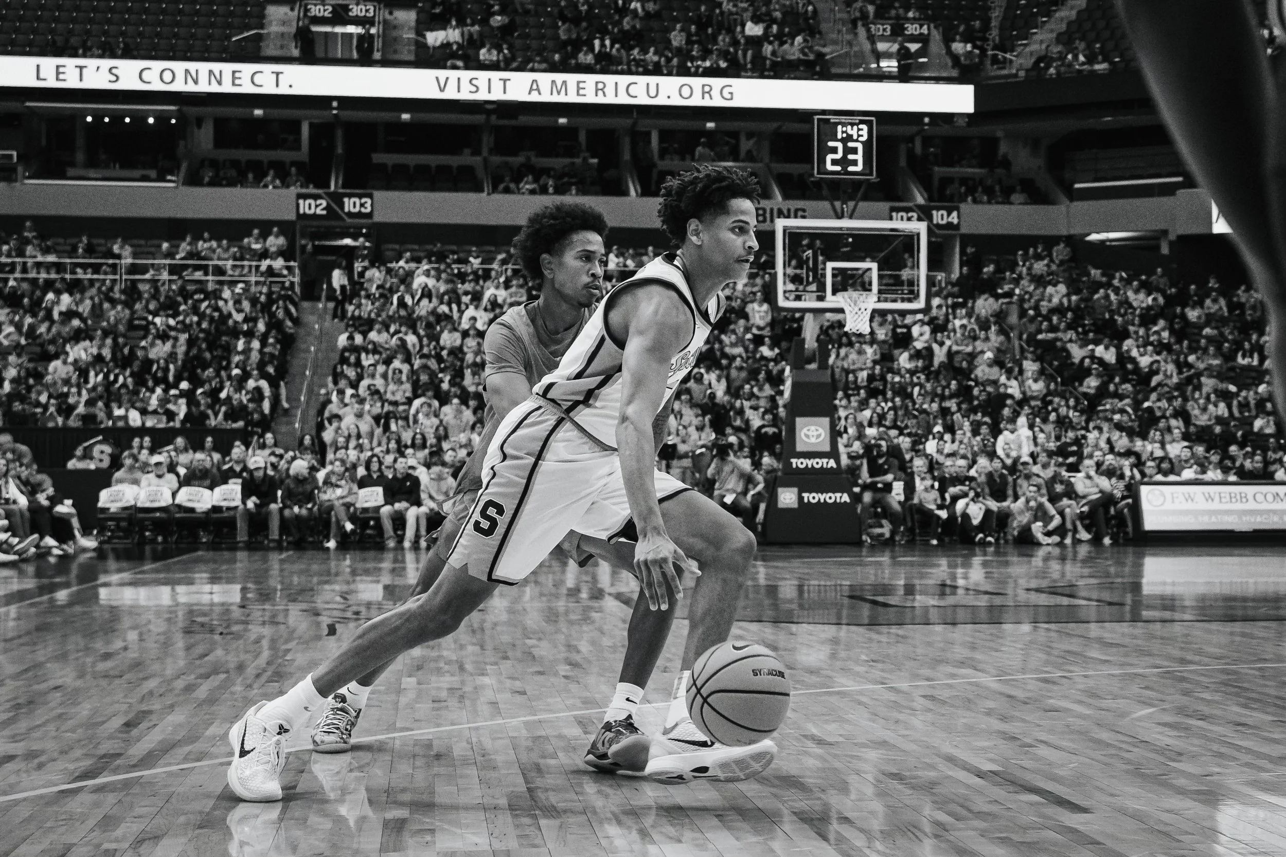 Baseline photos at the JMA Wireless Dome capture the intensity and athleticism for collegiate basketball.