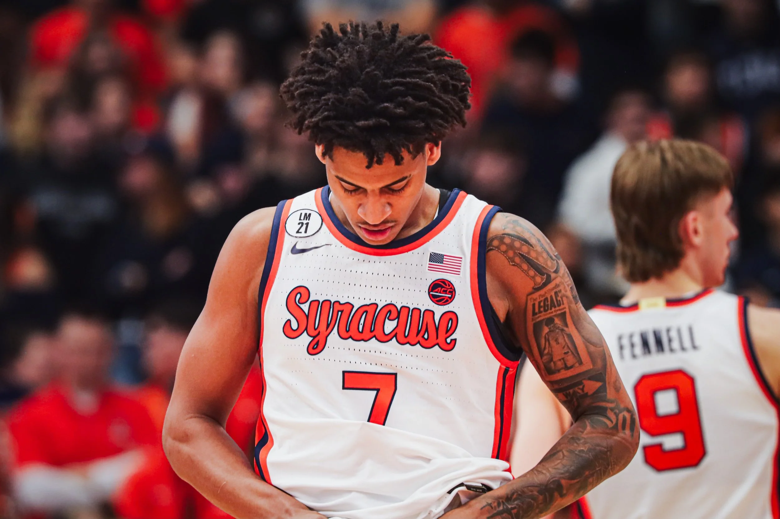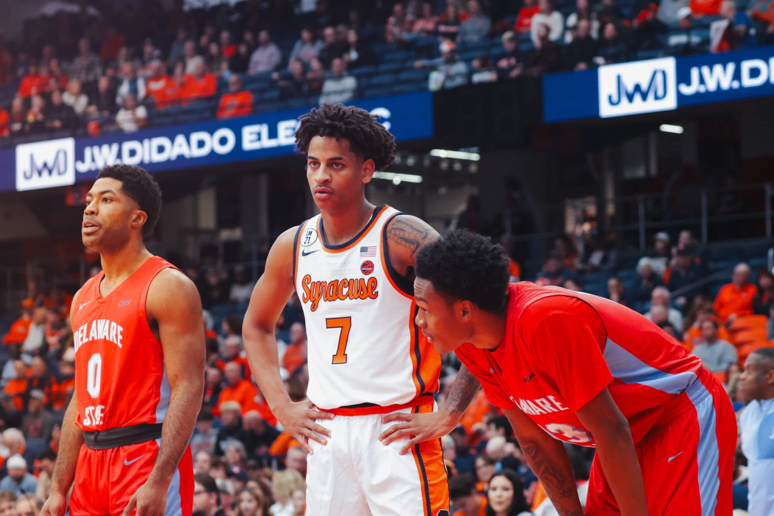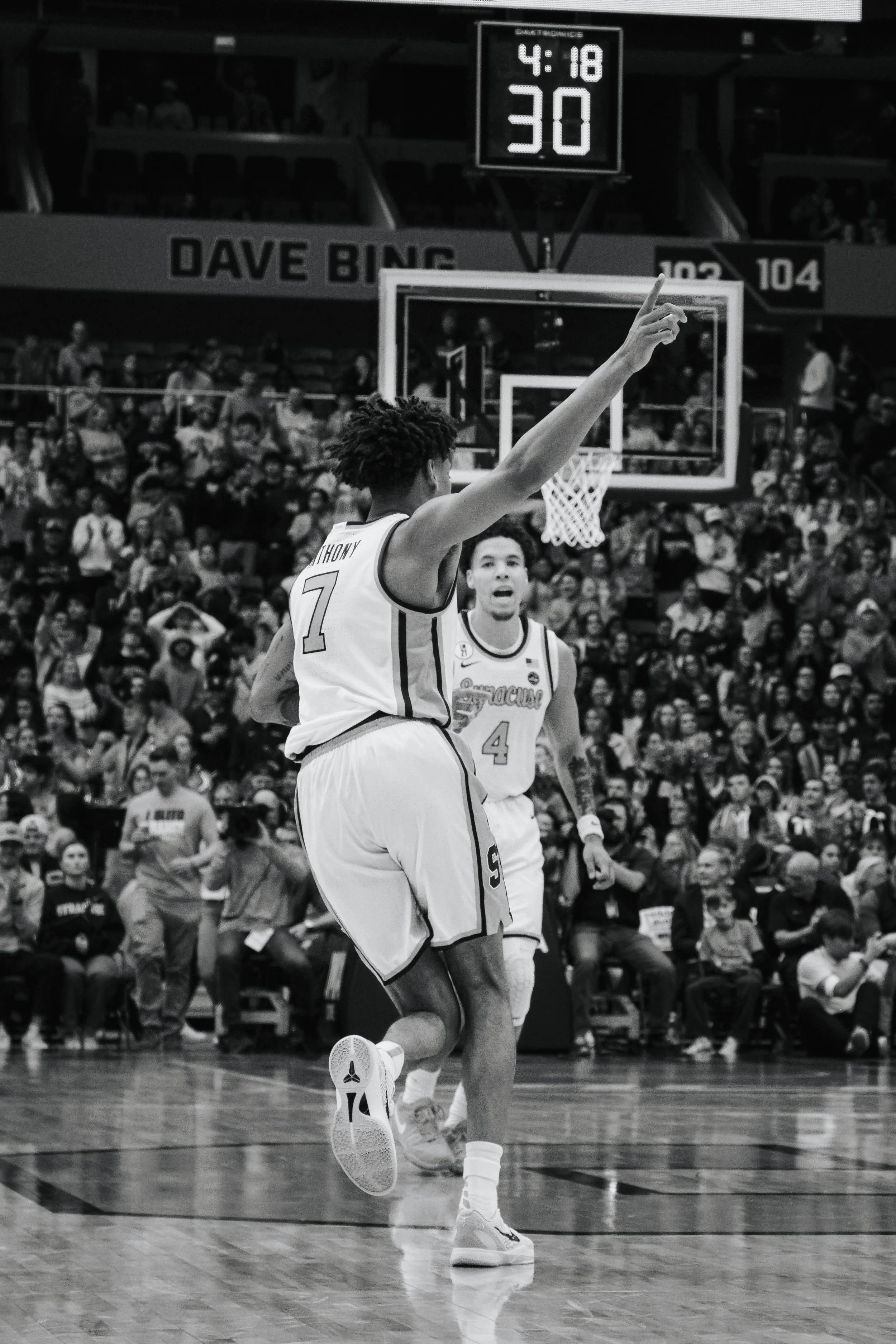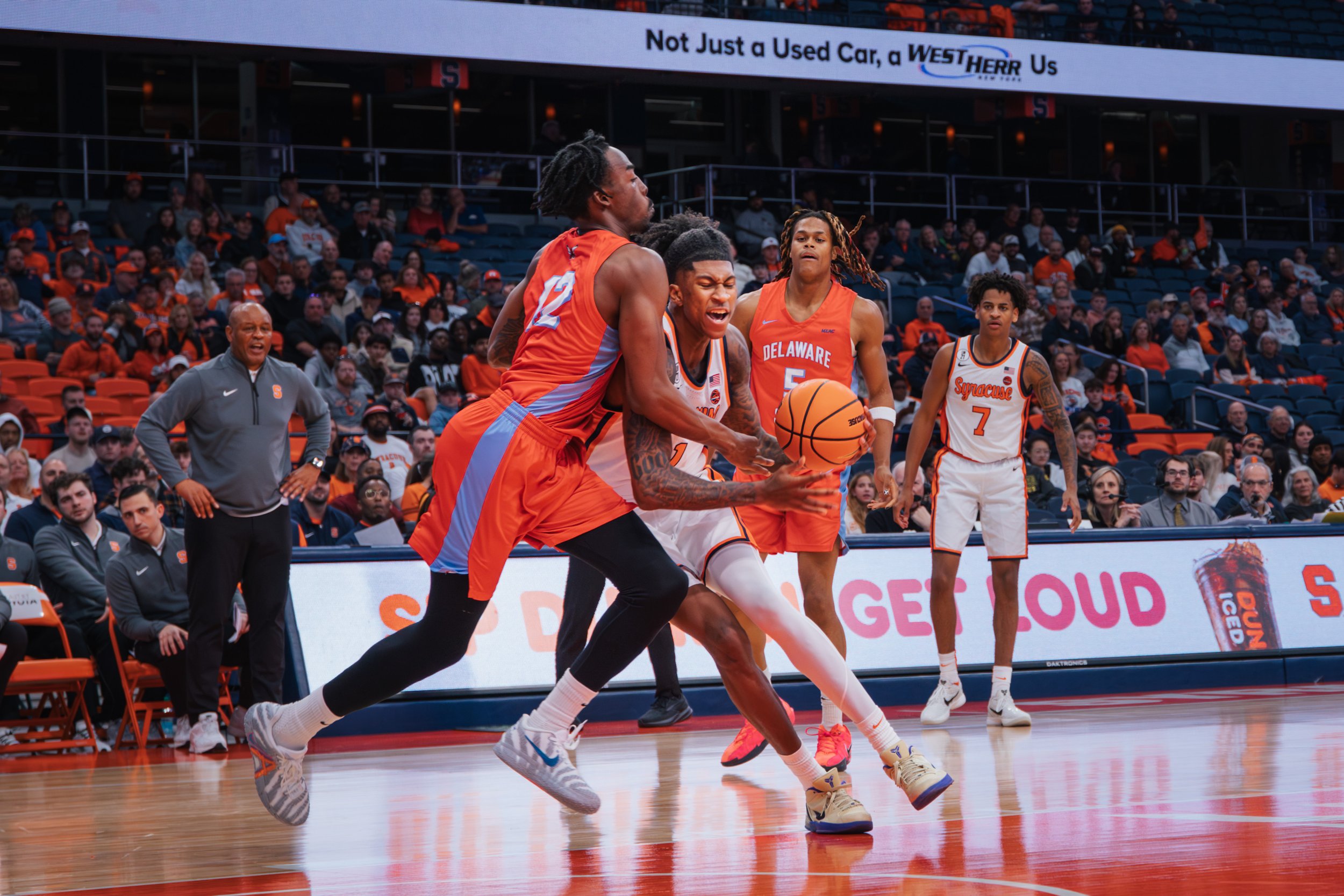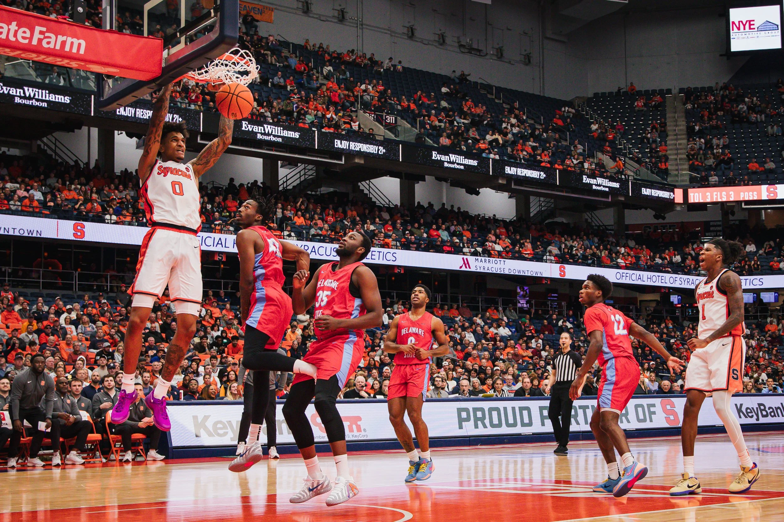 Baseline photos at the JMA Wireless Dome capture the intensity and athleticism for collegiate basketball.